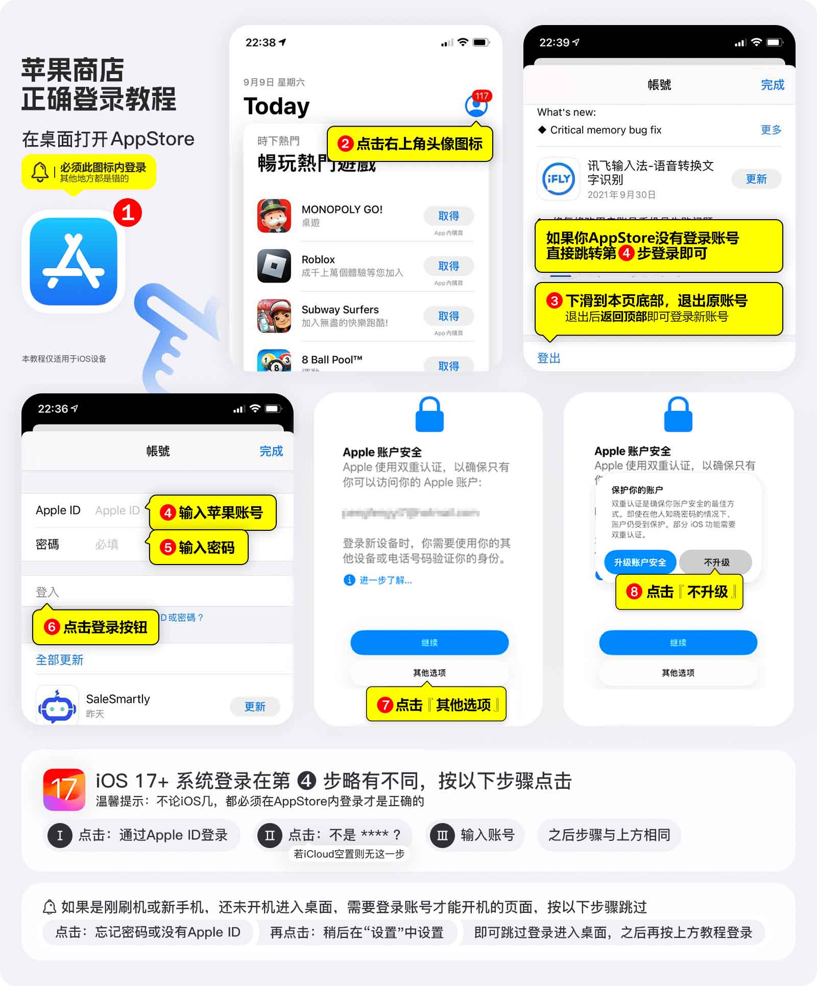 退出原 App Store → 登录本账号 → 下载应用 → 用完可退出 → 如需改密https://iforgot.apple.com